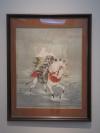 白馬に騎乗して川の中を進む謙信の像。福王寺法林は大正9年、米沢に生まれ、米沢で上村廣成に日本画を学びました。昭和11年に応召され、昭和21年に復員した後に上京して院展に出品するようになり、平成16年、文化勲章を受章するに至りました。これは復員して上京するまでの間に知人の求めに応じて制作されたとみられています。昭和前期の一般的な歴史画の手法が見られると指摘されています。川中島合戦をイメージした画像であり、米沢市民にとっての上杉謙信のイメージが端的に表現されています。(展示解説より)